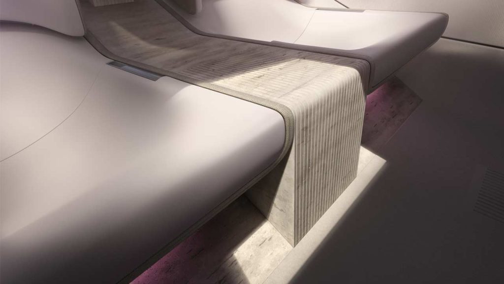 The white upholstery opens to reveal a cubby with a vibrant blue hue. Each totem alters features such as ambient lighting and screen graphics. It also plays a unique soundscape and releases scents. Jaguar suggested that bespoke totems could be tailored to individual customers. It remains to be seen how many of these “unique features” are gonna make it to production.