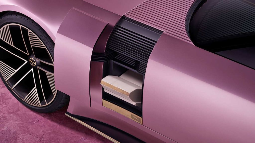 However, the Type 00 has a couple of interesting details. Notice that the concept has no traditional rear-view mirrors or visible cameras, and that is because the rear-view cameras are hidden inside the hand‑finished brass “ingot” on either side. The leaper on these is barely visible, but that is probably the idea, because you know, the leaper may scare the LGBTQ+ community. Right above these ingots are the so-called Prism case. The case contains three “totems” of natural materials – Brass, Travertine and Alabaster.