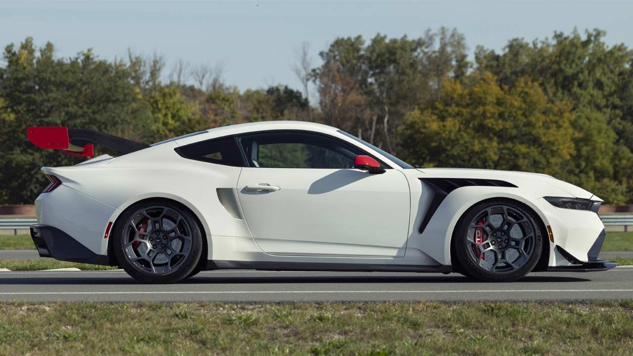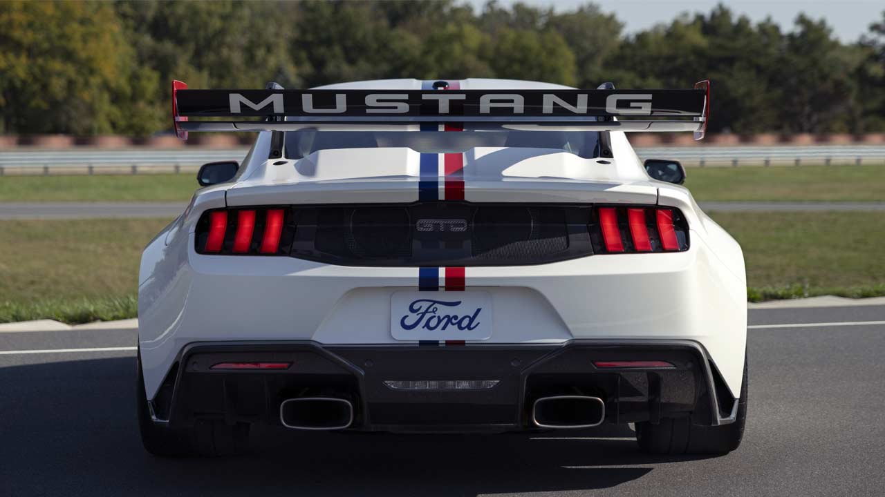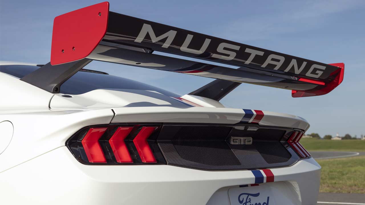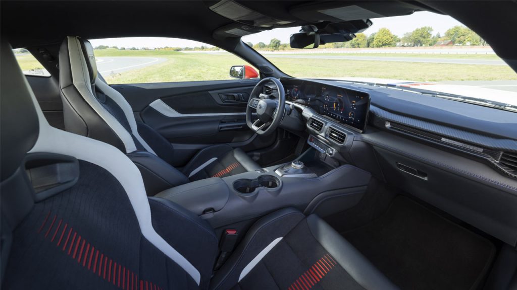 The twin painted racing stripes mimic Mustang’s Tribar logo from 1964, while the rear wing underside is branded ‘MUSTANG’ with end plates in Race Red. For the mirror caps, buyers have a choice of Race Red or exposed carbon fibre, while Race Red calipers are standard.