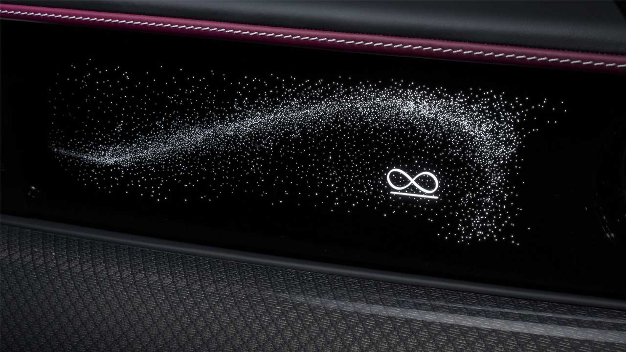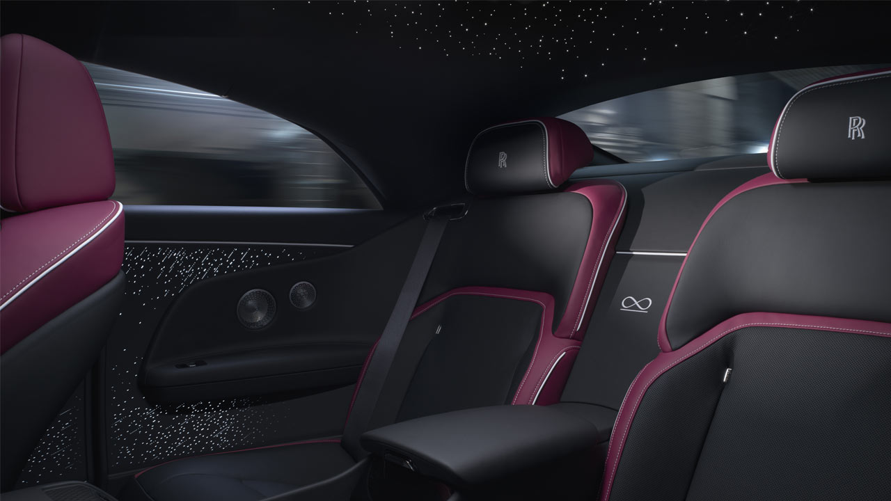 The dark theme continues on to the inside of the Spectre Black Badge. This particular example features a black-pale-maroonish upholstery, in combination with a Piano Black starry headliner. The Black Badge has its own logo, the Black Badge Infinity symbol, stitched into the leather ‘Waterfall’ section that separates the rear seats.
