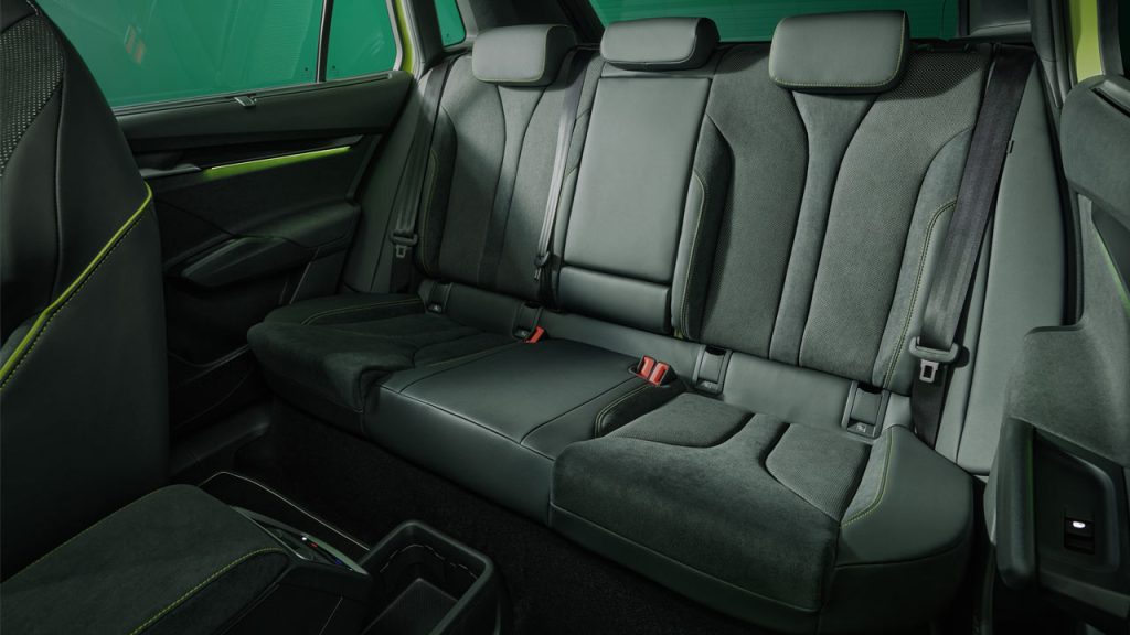 The dark interior certainly looks sporty, thanks to Suedia microfibre upholstery with lime green contrast stitching and a carbon-look décor. The three-spoke heated steering wheel is covered in perforated leather. It too comes with lime-green stitching along with a vRS badge. Heated front sports seats with integrated head restraints, electrically adjustable driver seat with massage, memory and lumbar support, 5-inch Digital Cockpit and the 13-inch infotainment display, and stainless-steel pedal covers, are some of the other key highlights.