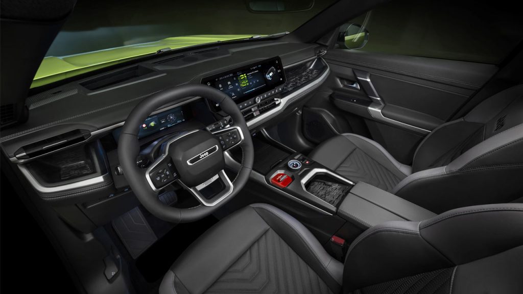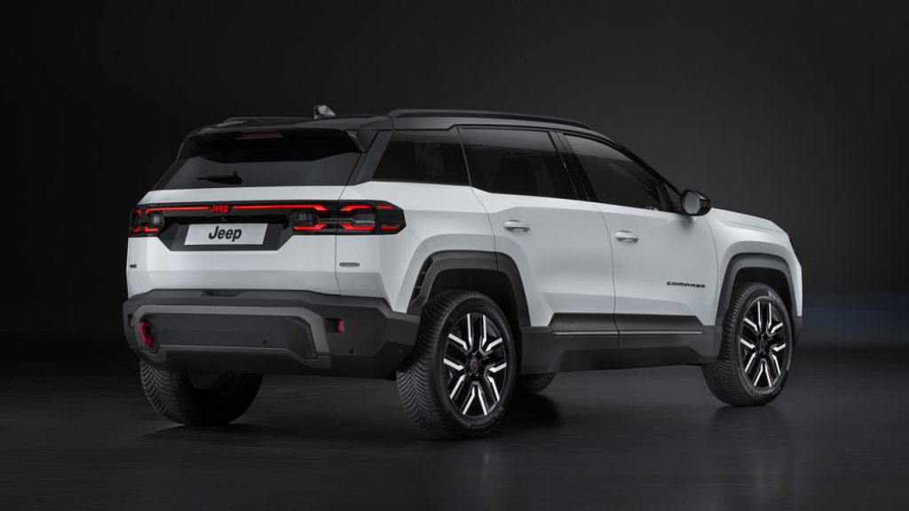 Moving on to the juicy bits of the story, the new Compass will be available in a bunch of flavours, including a 145 hp 48-volt mild-hybrid, a 195 hp plug-in hybrid, and 3 BEV versions—ranging from 213 hp FWD to 375 hp AWD. The electric AWD comes with a powerful rear electric motor that offers an additional 49 kW (67 metric hp) of peak power and up to 232 Nm (171 lb-ft) of torque. This motor is coupled with a 14:1 rear reducer, which translates into 3,100 Nm (2,286 lb-ft) at the rear wheels, Jeep says. The BEV versions are claimed to offer a range of up to 650 km (404 mi).