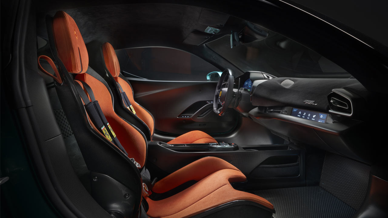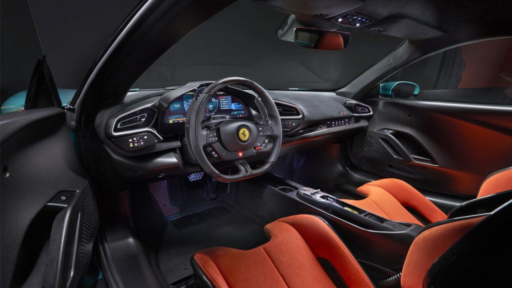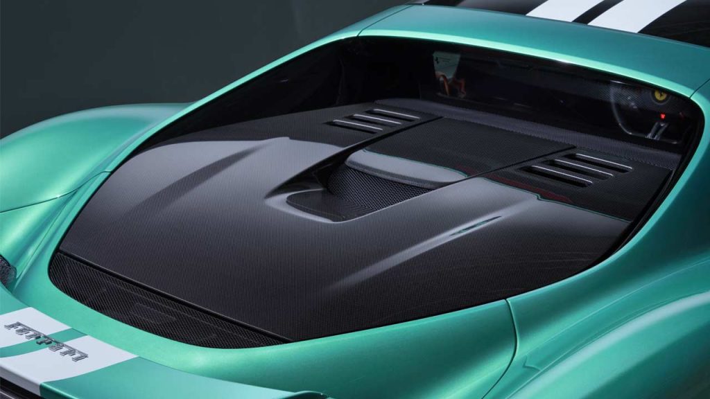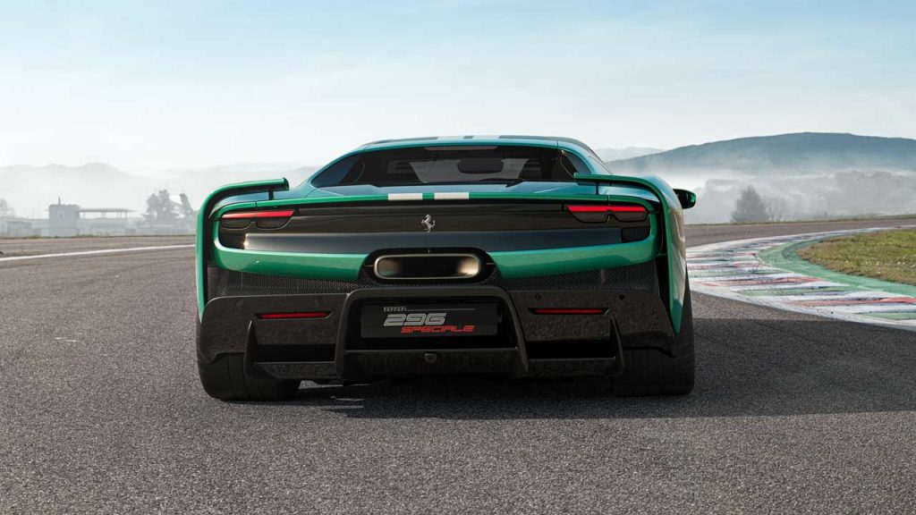 Thanks to those aforementioned aerodynamic changes, the 296 Speciale is claimed to generate 435 kg (959 lbs) of downforce at 250 km/h (155 mph) – 20% more than the 296 GTB. The carbon ceramic rotors are the same size as the 296 GTB (398 mm at the front and 360 mm at the rear). If you opt for all the optional lightweight stuff Ferrari sells, the dry weight of the 296 Speciale is claimed to be 1,410 kg (3,108 lbs), which, as mentioned earlier, is 60 kg (132 lbs) lighter than the GTB.