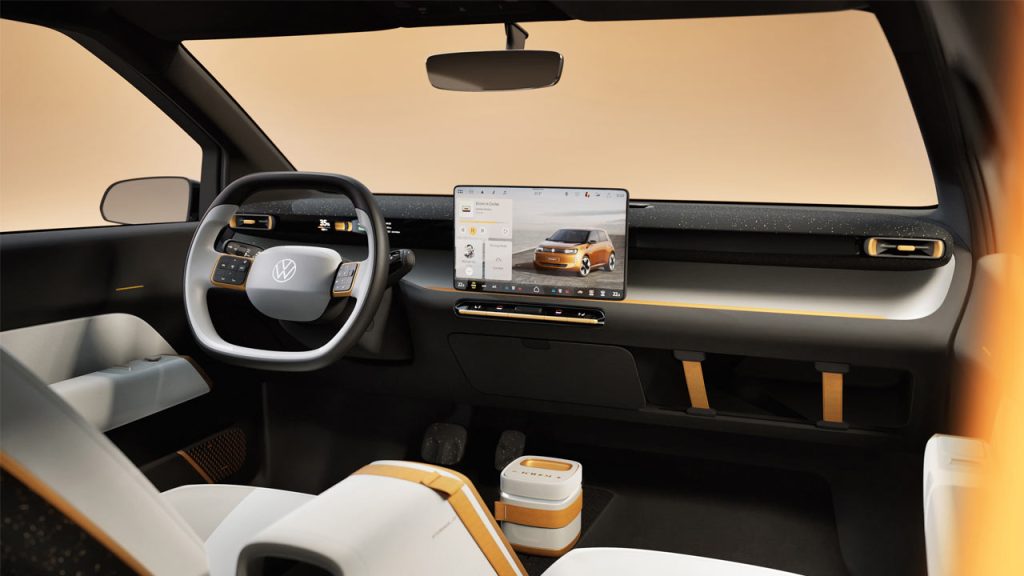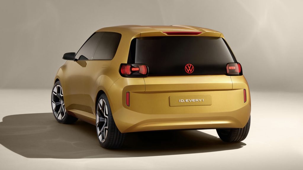 VW didn’t share many details, but the company wants you to know that the Every1 will be powered by a newly developed 70 kW (95 metric hp) electric motor that is good for a top speed of up to 130 km/h (81 mph). The range is at least 250 km (155 mi), VW says.