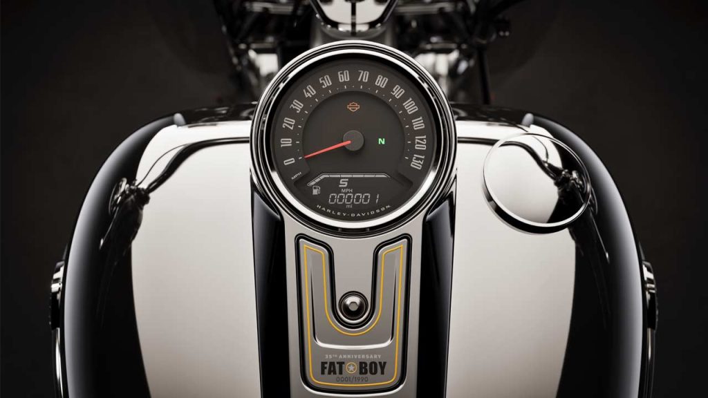 Styling cues inspired by the original Fat Boy include a round air cleaner, yellow accents on the lower rocker covers, powertrain covers, and tank console insert. Additional details—such as a leather seat valance with lacing and tassels, and a black leather tank strap with laced edging—add to the nostalgic aesthetic. 3D fuel tank medallions replicate the iconic winged graphic from the original Fat Boy. A commemorative tank console insert is etched with the bike’s unique serial number, while the Icons Collection medallion is positioned on the rear fender.