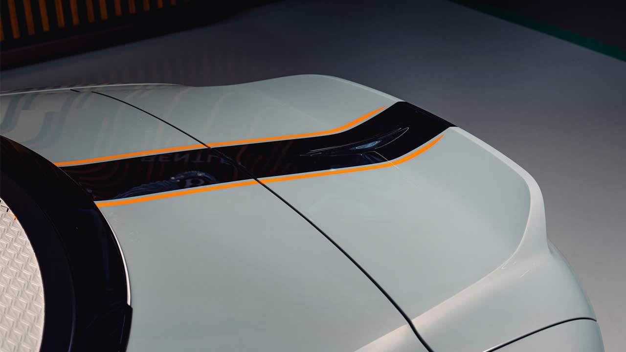 The Batur Convertible car zero is finished in something called Opalite, a shimmering silver, which is contrasted with a gloss black racing stripe bordered on each side by Mandarin (orange) pinstripes. The same Mandarin orange highlights can be found on the matrix grille and on the wheels. Not sure if the car is headed to China or Hong Kong, but of course, don’t be surprised if it does.