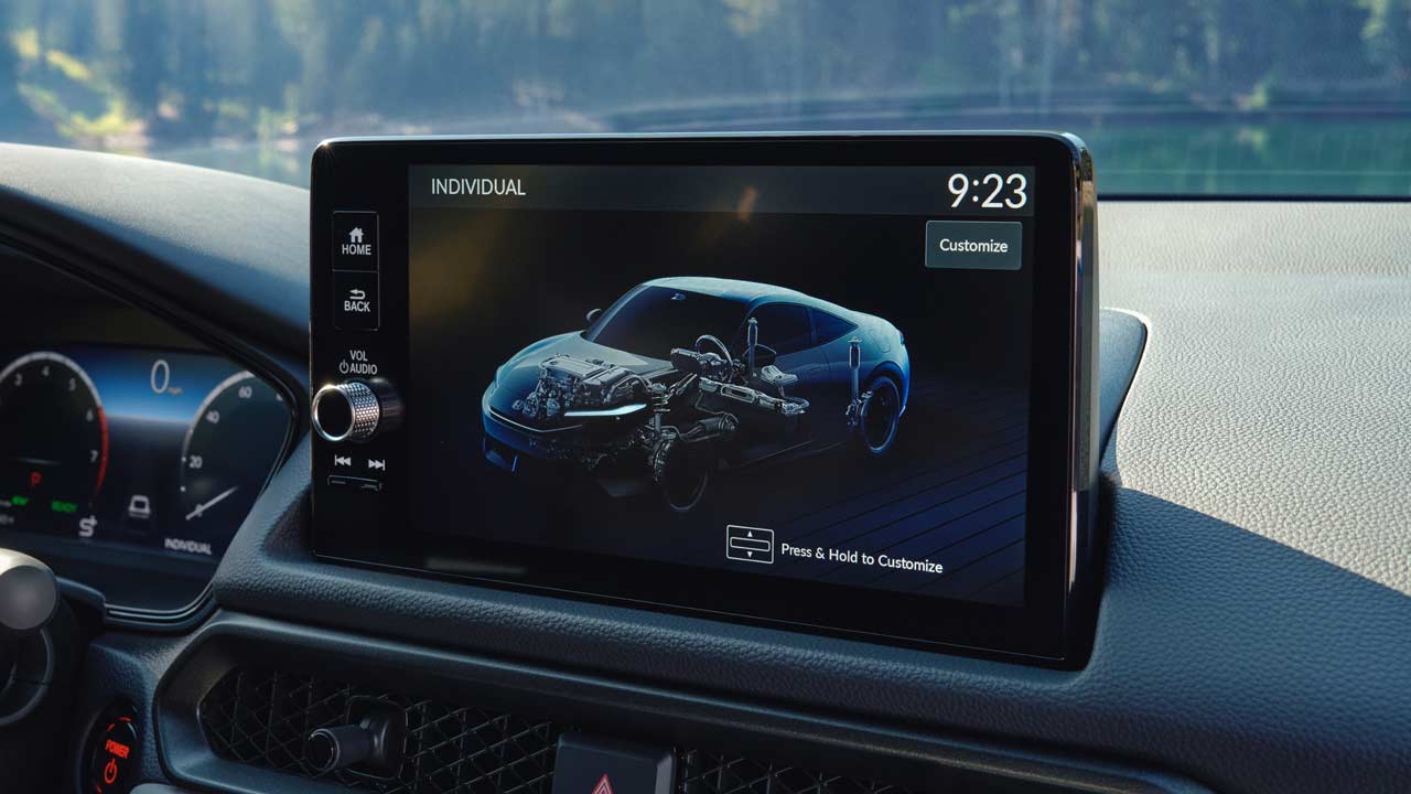 Key features inside include leather-trimmed sport seats with perforated houndstooth pattern, a flat-bottom steering wheel with alloy shift paddles, a 9-inch touchscreen, a 10.2-inch digital cluster, wireless Apple CarPlay & Android Auto connectivity, a wireless smartphone charger, and an 8-speaker Bose Centerpoint premium sound system. The Honda Sensing suite of safety and driver-assistive technologies are included as standard.