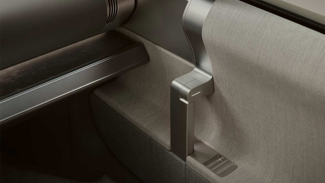 The interior is just as minimalistic with calm and soothing tones. I love that steering wheel with horizontally oriented circular controls. Notice that there’s no giant touchscreen in the middle? Well, there is a 10.4-inch display, but it is hidden. It can be summoned with a toggle control in the centre console.