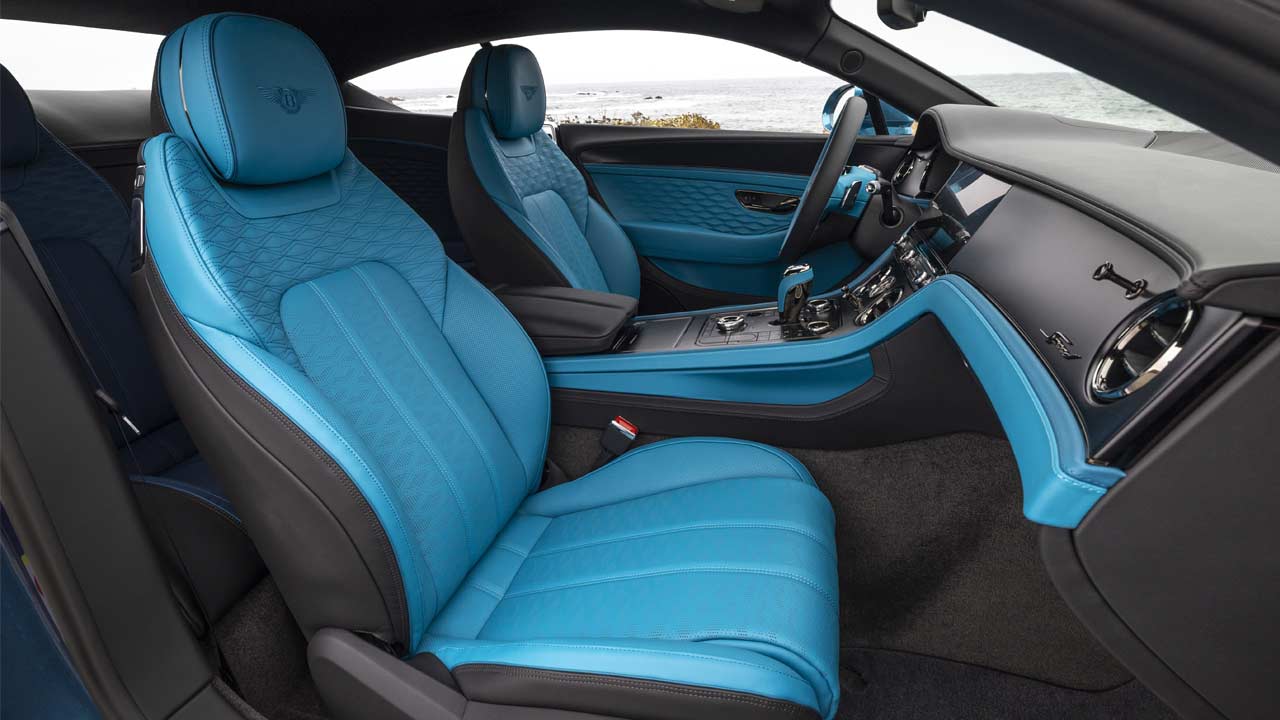 The car features what is essentially a gradient paint scheme that fades from ‘Topaz’ at the front to ‘Windsor Blue’ at the rear. This paint blend is created with traditional mixing methods and is hand-applied in multiple stages. This overall fade effect takes two paint technicians approximately 56 hours to apply, Bentley said. Notice that the wheels, too, are included in this fade effect. Personally, I’d prefer all four wheels to be in the darker shade of blue (Windsor Blue).
