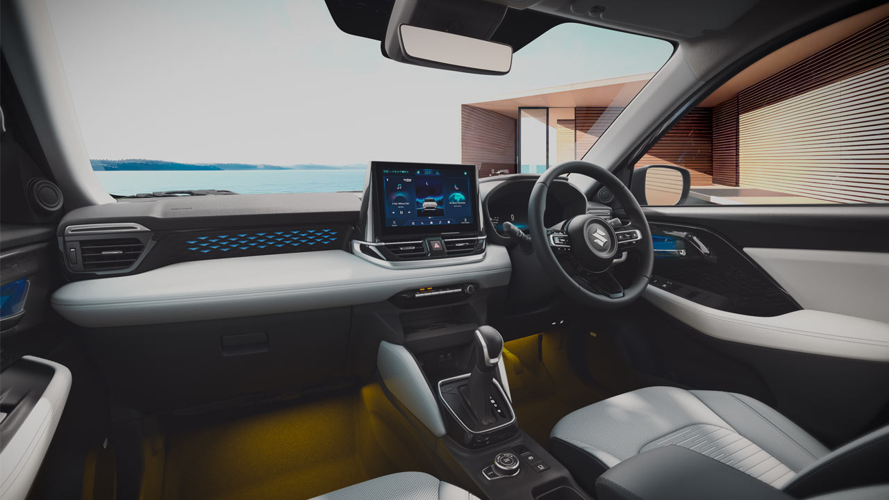 Key features inside include a 10.1-inch touchscreen infotainment system, a 10.25-inch digital cluster, wireless Apple CarPlay & Android Auto connectivity, 8-speaker Infinity audio system with Dolby Atmos 5.1 surround sound, 64-colour backlit ambient mood lighting system, PM2.5 filter with AQI display, and Suzuki Connect connected car features. Passive safety includes standard 6 airbags, while active safety includes Level 2 ADAS suite. The suite includes Automatic Emergency Brake, Adaptive Cruise Control, Lane Keep Assist, High Beam Assist, Rear Cross Traffic Alert, Blind Spot Monitor, and Lane Change Alert.