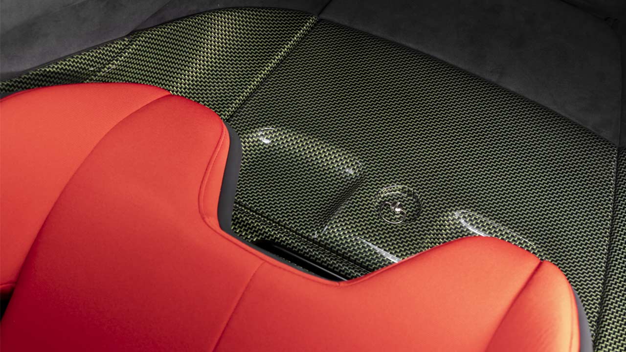 Inside, you’ll not find significant differences except for bespoke Carbon-Kevlar appliques. The seat upholstery is a combination of Charcoal Alcantara and a red Jacquard technical fabric.