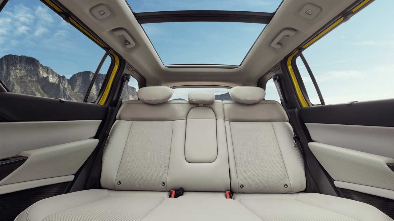 Inside, things look clean, minimalistic, and of course, very, very airy, thanks to that XXL-sized glass roof. In addition to a digital cluster and a touchscreen, there’s a passenger display as well, as is the trend these days. Notice that gray-ish thing underneath the central air vents? Well, that’s a soundbar, part of the JBL 12-speaker audio system.