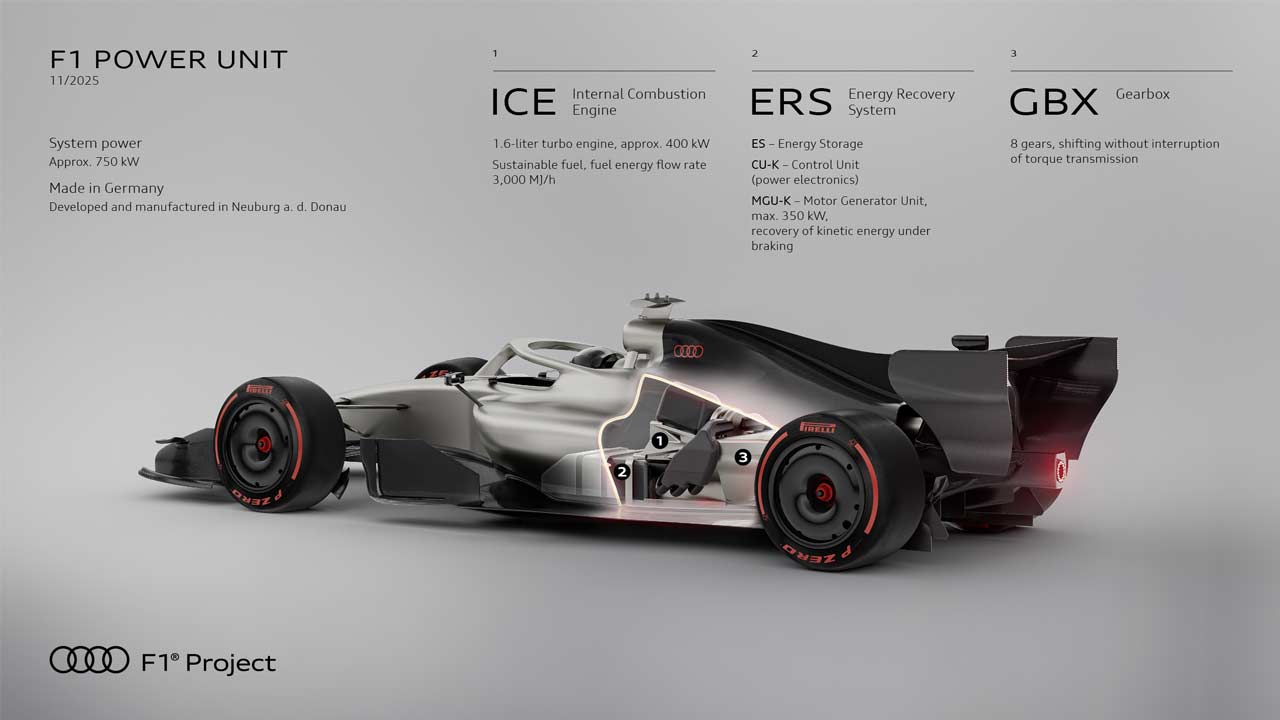 Audi also disclosed that it has been working on a 1.6L V6 turbo for this car in Neuburg an der Donau since spring 2022. As you may know, a modern F1 car is a hybrid, which means, in addition to an ICE, there’ll also be an energy recovery system (ERS) including energy storage (ES) and an electric motor generator unit (MGU-K), as well as an electronic control unit (CU-K). In addition to the ICE, the gearbox is also being developed in Neuburg.