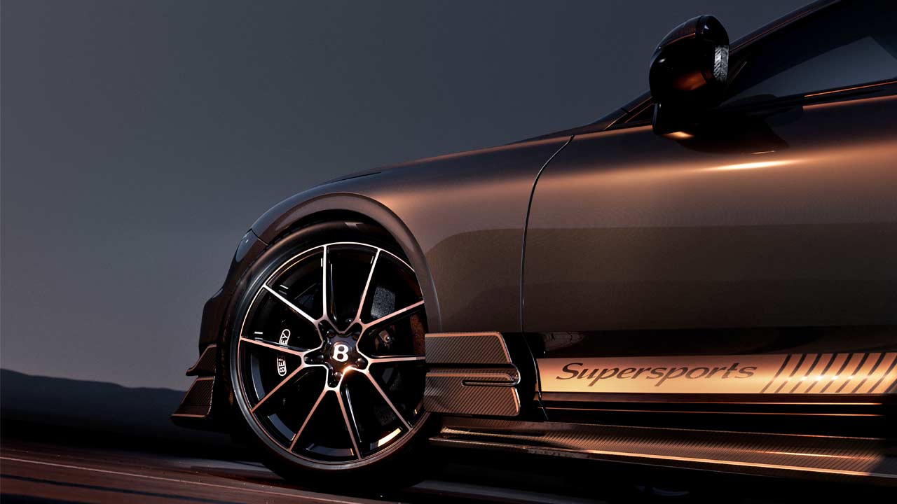 With that out of the way, let’s talk about the car itself. As you can tell, the Continental GT Supersports wears a more aggressive aerodynamic carbon fibre bodykit with a large front splitter, canards, fender blades, rear diffuser, and of course, a fixed rear wing. The aerodynamic elements together are claimed to generate more than 300 kg (661 lbs) downforce compared with the Continental GT Speed. The roof is also carbon fibre to cut down weight. The car rides on massive 22-inch lightweight forged and machined aluminium alloy wheels, co-developed with Manthey Racing. There are two tyre options: standard Pirelli P-Zero or new Trofeo RS performance tyres; the latter is claimed to enable the Supersports corner approximately 30% quicker than a Continental GT Speed, with up to 1.3 g peak lateral force.