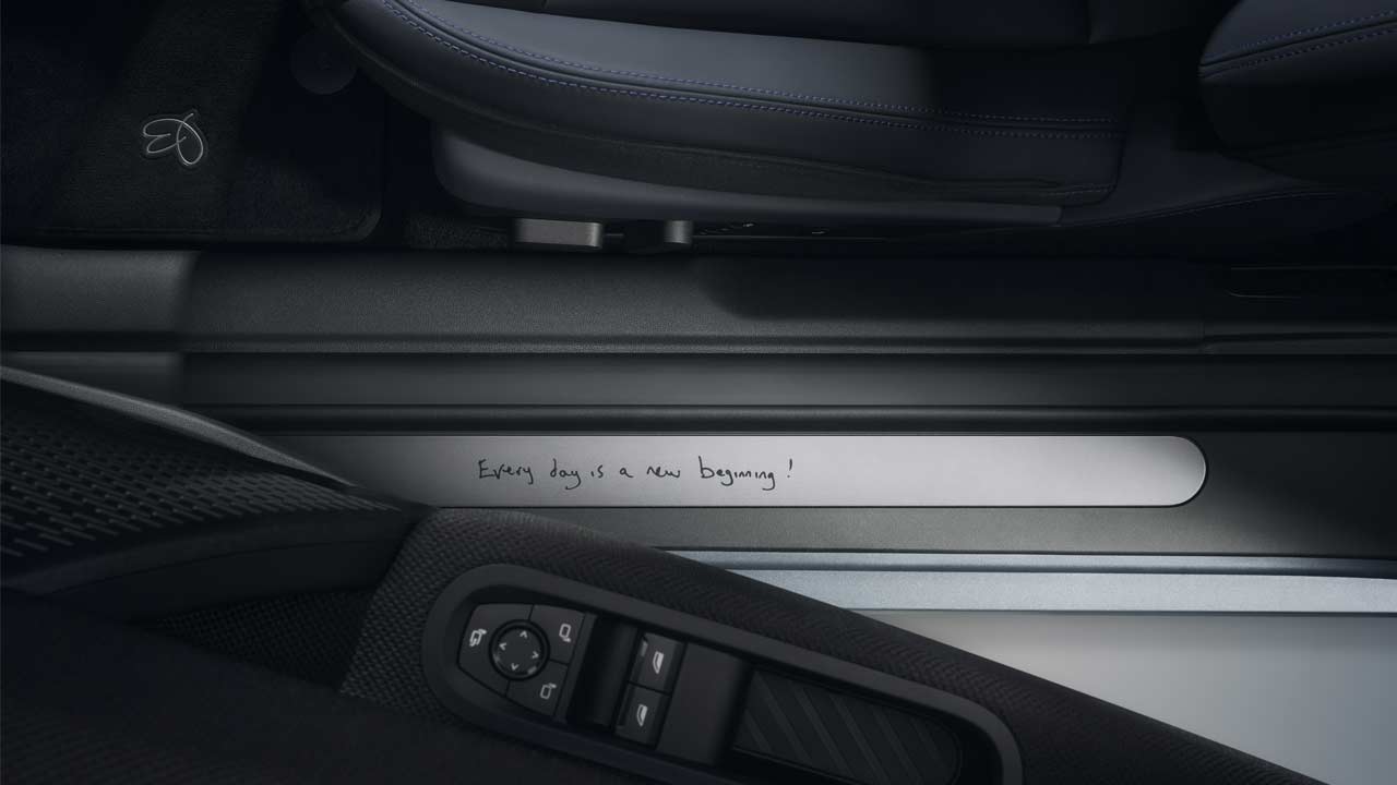 Besides the Paul Smith branding, there are a few more details on the inside. The Nightshade Blue sports seats are upholstered with Vescin (a synthetic leather) and have knitted textile in the shoulder and headrest areas. You can also notice the Signature Stripe brand on the steering wheel. The dashboard and door pads feature knitted surfaces with stripe patterns.