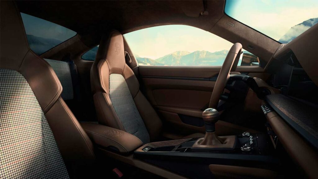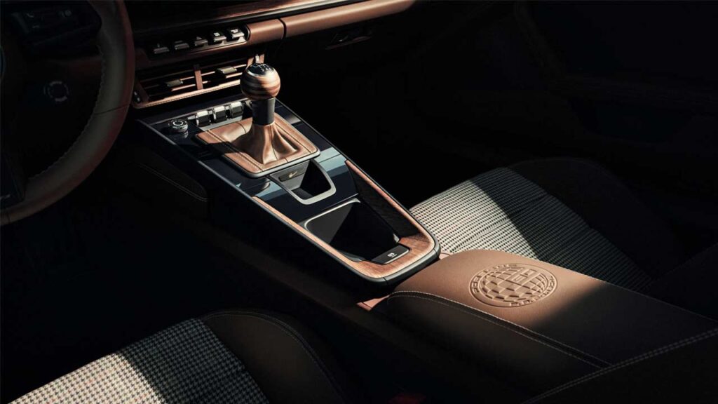 The Sport Chrono watch at the top of the dashboard is based on the original Chronograph I, which was created as a one-off piece for F. A. Porsche. Another highlight inside the car is the open-pore walnut plywood gear knob. A gold-plated plaque, ‘One of 90’ on the dashboard, illuminated door sill, and a welcome light projection are among the other key highlights.