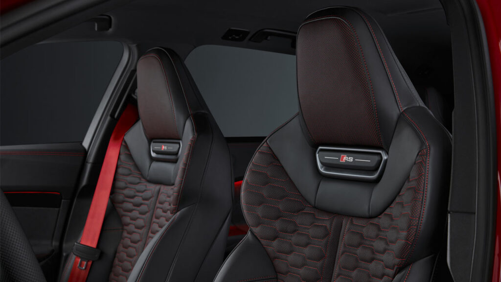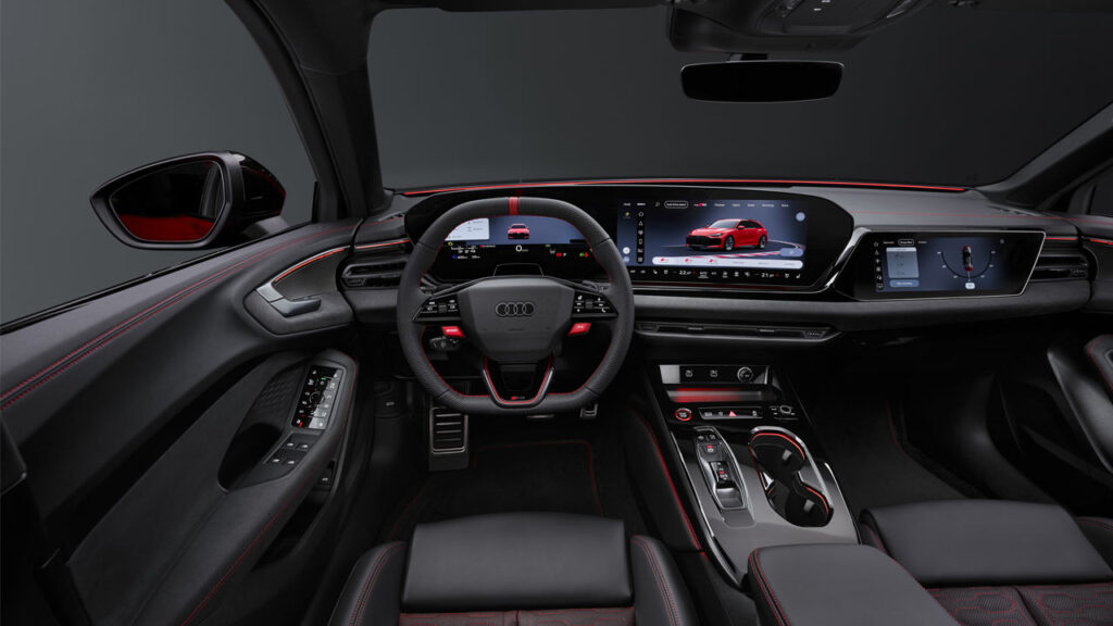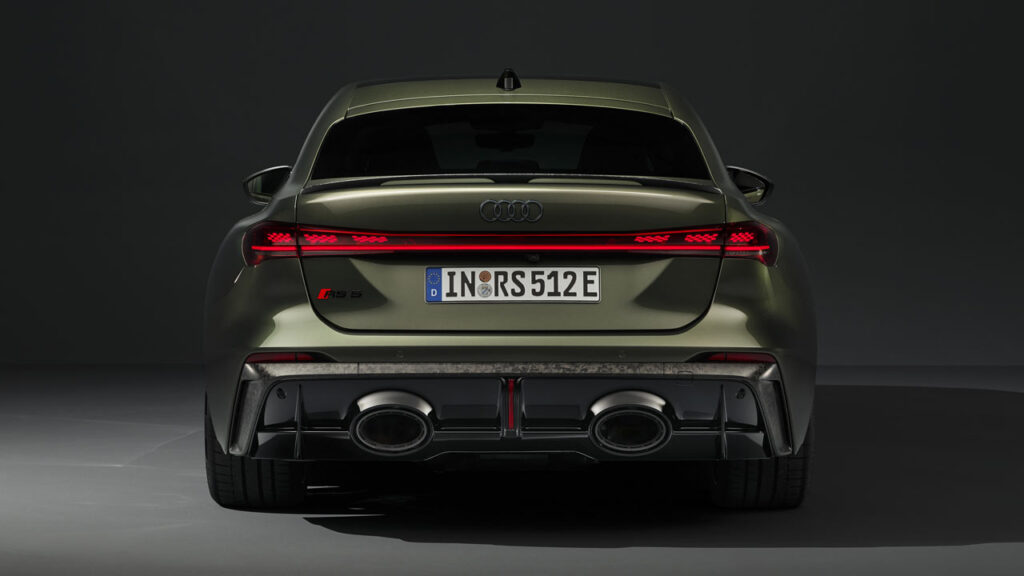The new RS5 models look absolutely stunning, don’t they? I think many will buy them just for the looks. The front fascia is dominated by a large 3D honeycomb grille, flanked by large air intakes on the sides. The headlights shown here are optional darkened Matrix LED headlights with an RS-specific DRL signature in a checkered-flag layout. The rear fascia features second-gen OLED taillights with communicative animations. The oval tailpipes of the sport exhaust system look rather large, too.