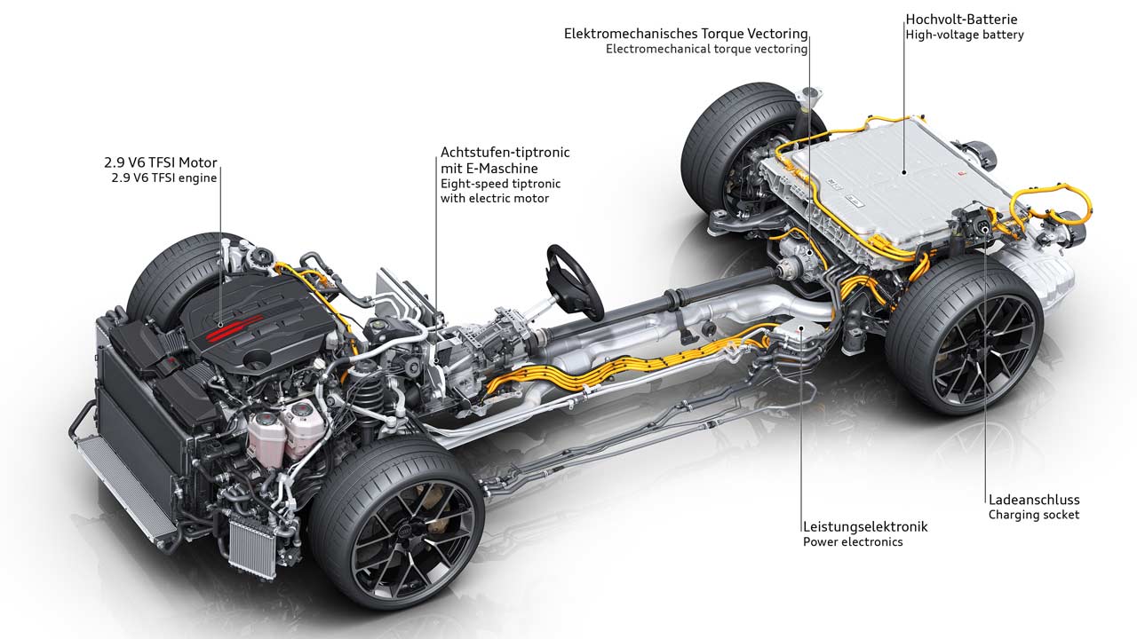 Moving on to the business end of the story, then, the new RS5 packs a plug-in hybrid powertrain, as suggested by the infographic above. The powertrain combines a 2.9L twin-turbo V6 petrol engine with a permanent magnet electric motor integrated into an 8-speed torque-converter gearbox. There’s also an electromechanical torque vectoring on the rear axle, billed as a world first in a production model. In the system, a water-cooled permanent-magnet electric motor with an output of 8 kW (11 metric hp) and 40 Nm (29.5 lb-ft) serves as a high-voltage actuator.