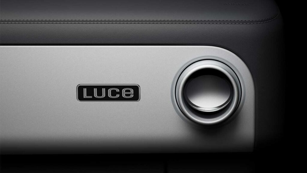 The Luce’s interior was designed in collaboration with San Francisco-based LoveFrom, a creative agency led by ex-Apple designer Sir Jony Ive and industrial designer Marc Newson. As you can probably tell, tactility has been given a top priority in the Luce. You’ll see a lot of physical controls here. That handle thing on the central touchscreen, for instance, is to rotate the touchscreen either towards the driver or the passenger. The retro three-spoke steering wheel is made of recycled aluminum and is claimed to weigh 400 grams less than a standard Ferrari steering wheel. Notice the wiper switch on the steering wheel? It has a magnifying glass to highlight the selected mode. It may seem unnecessary, but small things like these make a great UX.